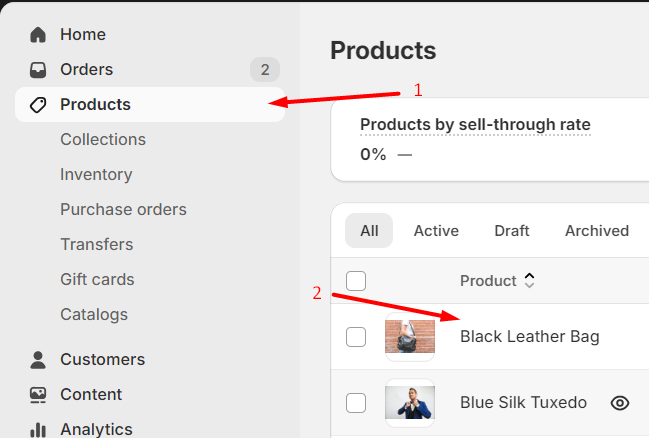- Í Shopify stjórnborðinu, veldu Products (Vörur) í vinstri valmyndinni.