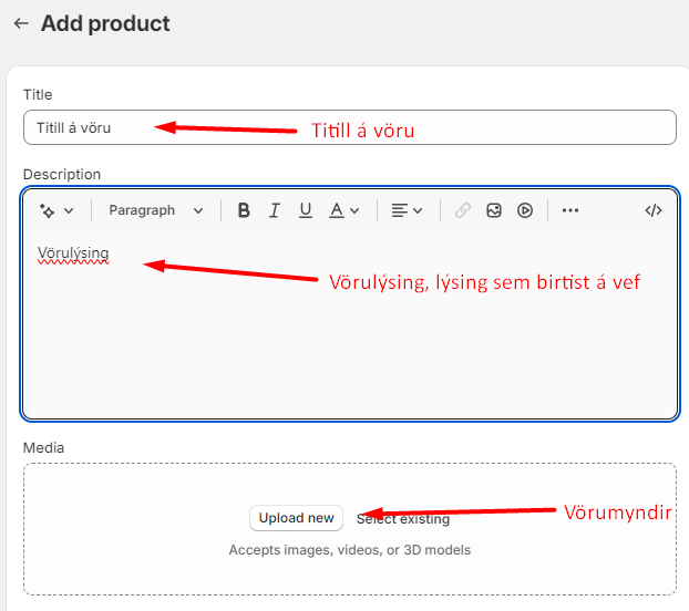 - Media (Myndir/Vídeó): Smelltu á Upload new til að bæta við myndum eða vídeóum sem lýsa vörunni. Einnig er hægt að ýtta á Select existing ef þú þarft eldri myndir.