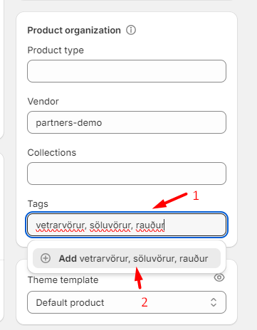 - Undir Tags (Merkimiðar), sláðu inn merkimiða fyrir þína vöru.