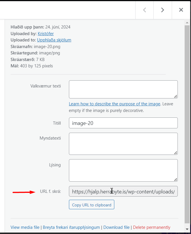 Undir ‘Add new media file’ getur þú sett inn skrá og hún mun birtast á hýsingunni. Þegar þú ferð svo í ‘Gagnayfirlit’ getur þú ýtt á skránna og þá færðu nánari upplýsingar. Þar finnurðu URL að skránni eins og á myndinni hér að neðan.